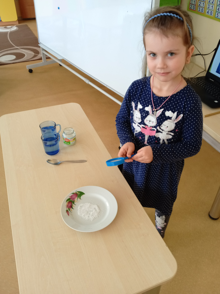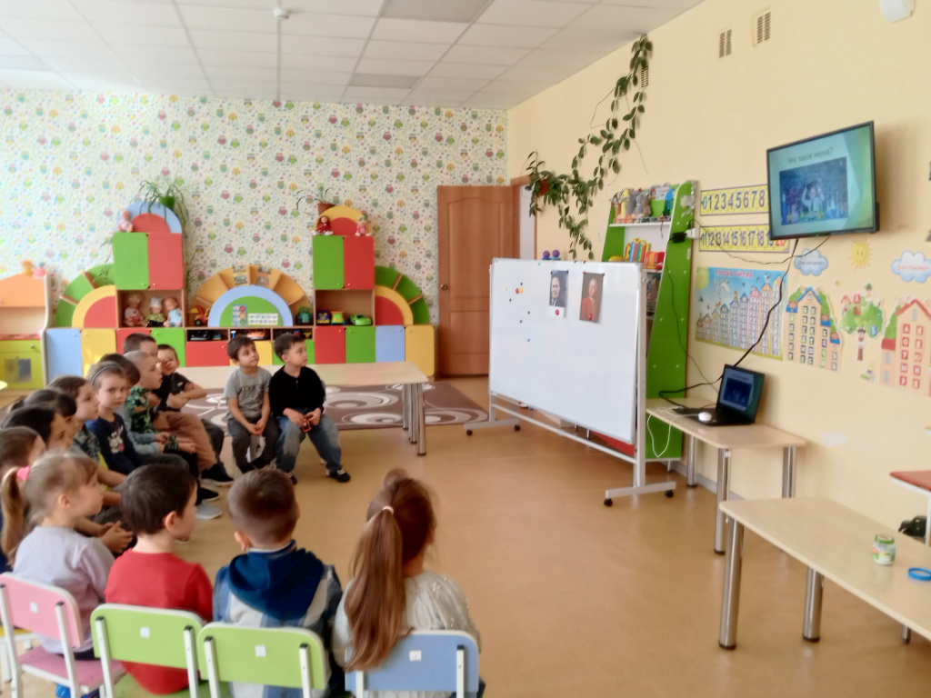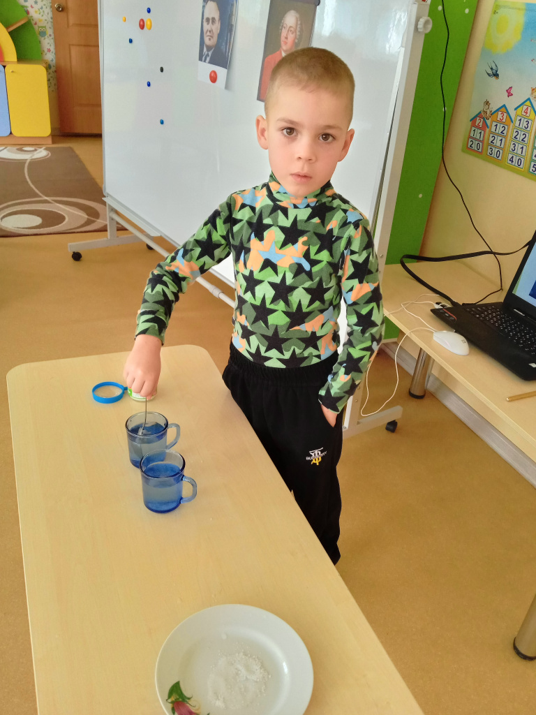 В старшей группе «Непоседы» воспитатель Елена Юрьевна провела беседу. Дети посмотрели презентации об известных российских учёных и провели опыты с солью. Они выяснили, что соль состоит из кристаллов, рассмотрели её через увеличительное стекло и заметили, что в горячей воде она растворяется быстрее, чем в холодной.