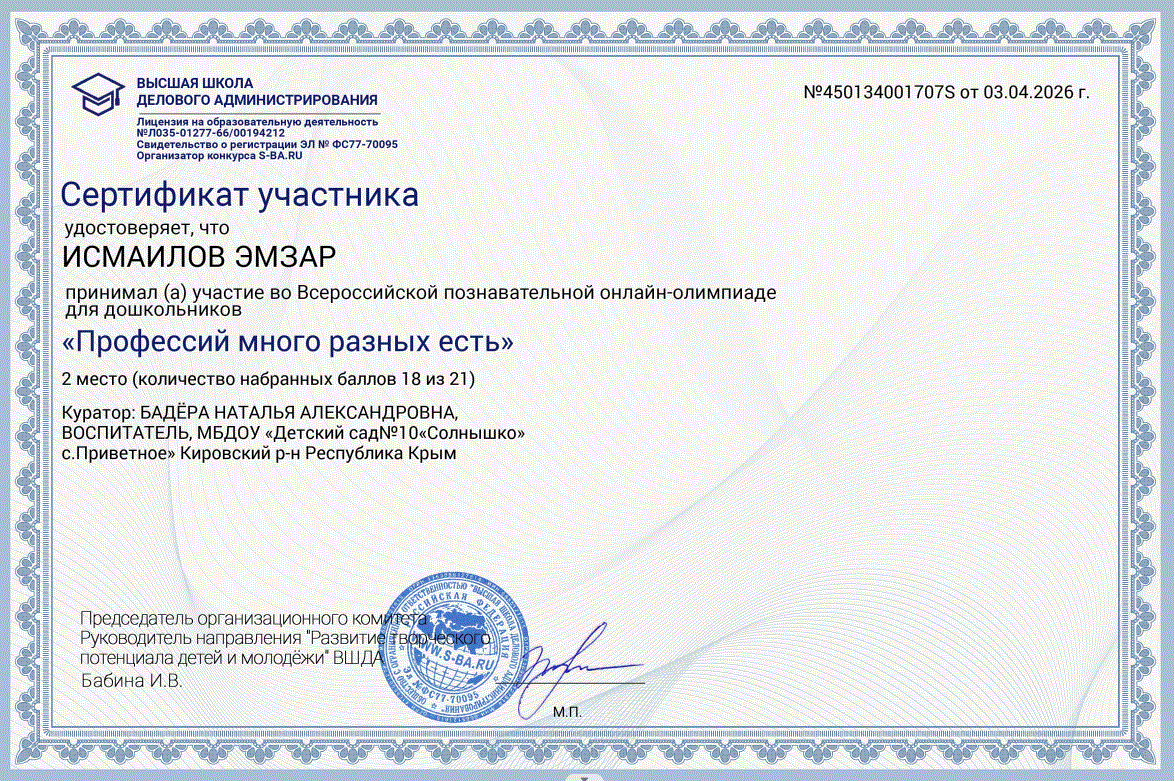 Поздравляем Исмаилова Эмзара, воспитанника подготовительной группы «Гномики», за участие во Всероссийской познавательной онлайн – олимпиаде для дошкольников «Профессий много разных есть». Эмзар занял 2 место (количество набранных баллов 18 из 21)