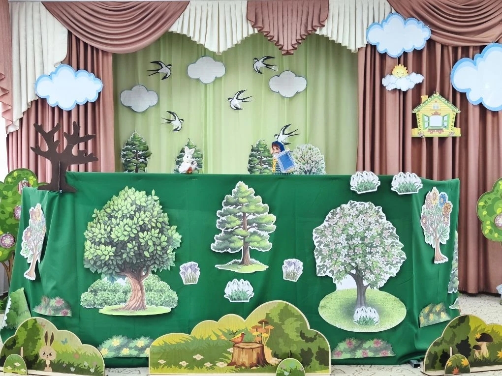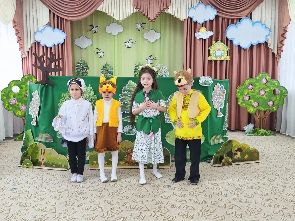 На фоне ярких декораций один за другим появлялись герои сказки. Зрители с интересом следили за сюжетом и огорчились, когда жадная Ворона украла подушку, которую Аленка сшила для Солнышка. Но друзья Солнышка — Медведь, Заяц и Лиса — вернули подарок.