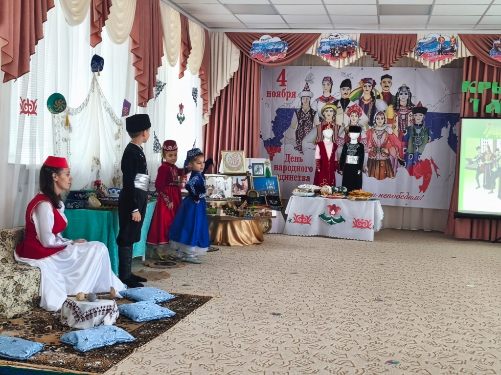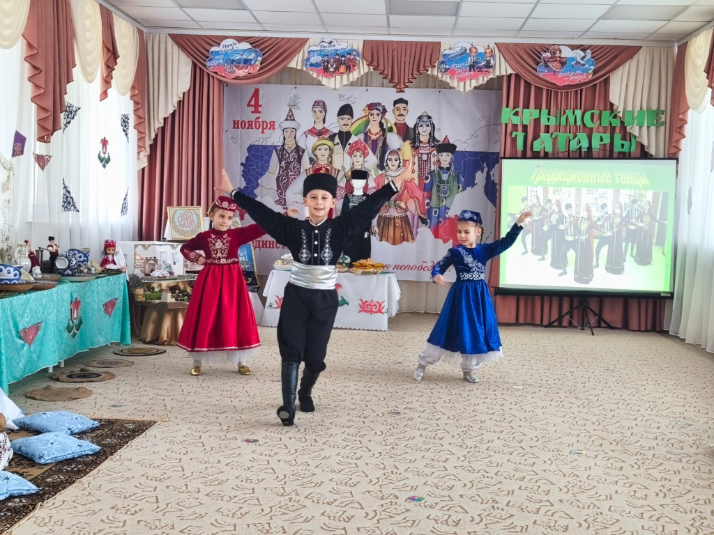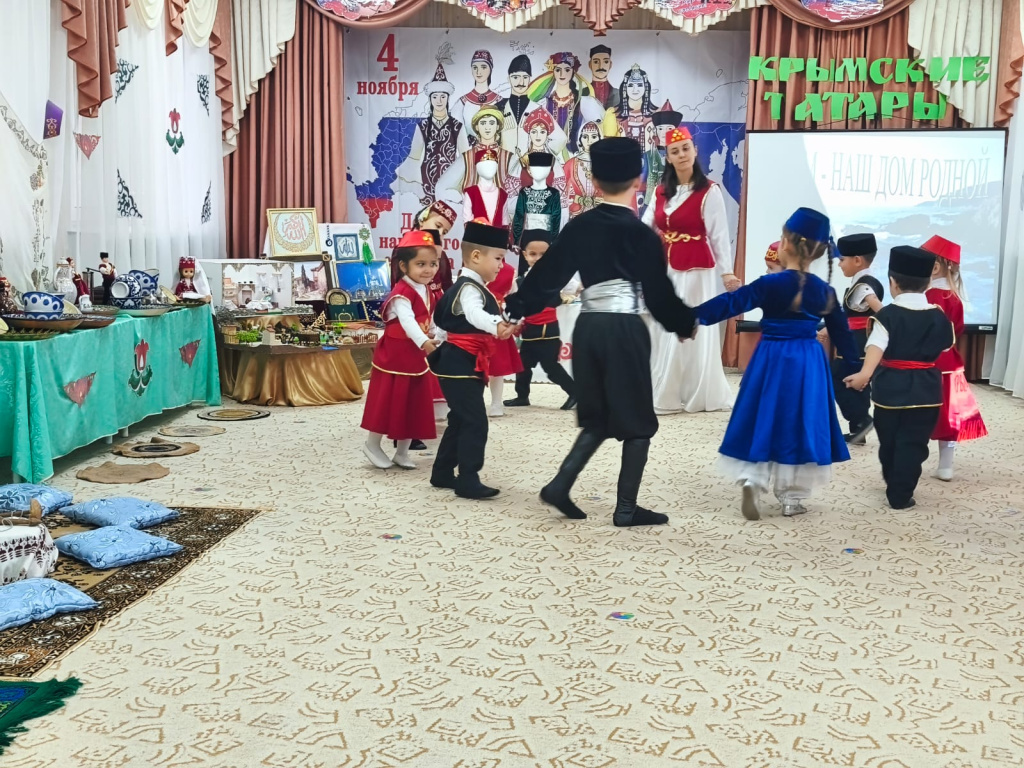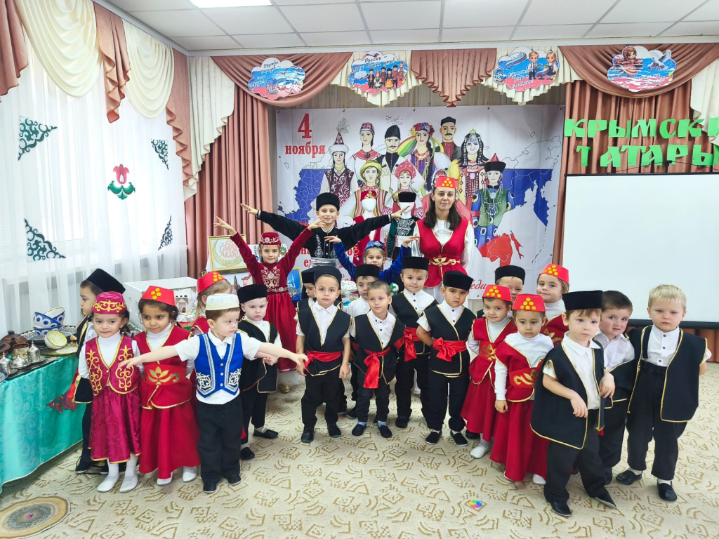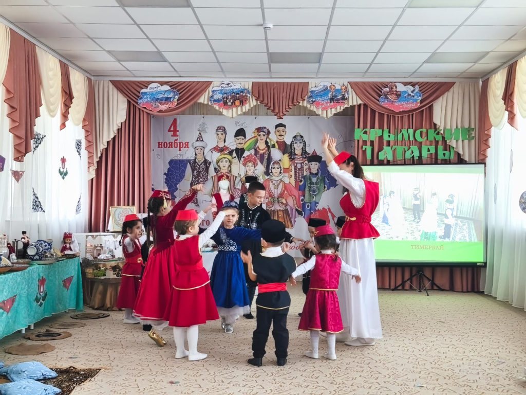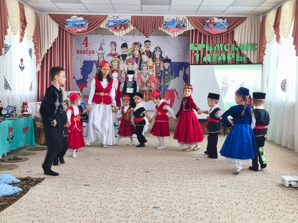 Младшая группа «Смешарики» под руководством воспитателя Решетовой Э.Л. организовала мероприятие, на котором представители национальность -Крымские татары, познакомили детей с традициями и обычаями этого народа. Гости исполнили национальные танцы, сыграли в народные игры и прочитали стихи. Дети смогли узнать о культуре крымских татар, их быте и национальных костюмах. Праздник получился насыщенным, познавательным и весёлым.